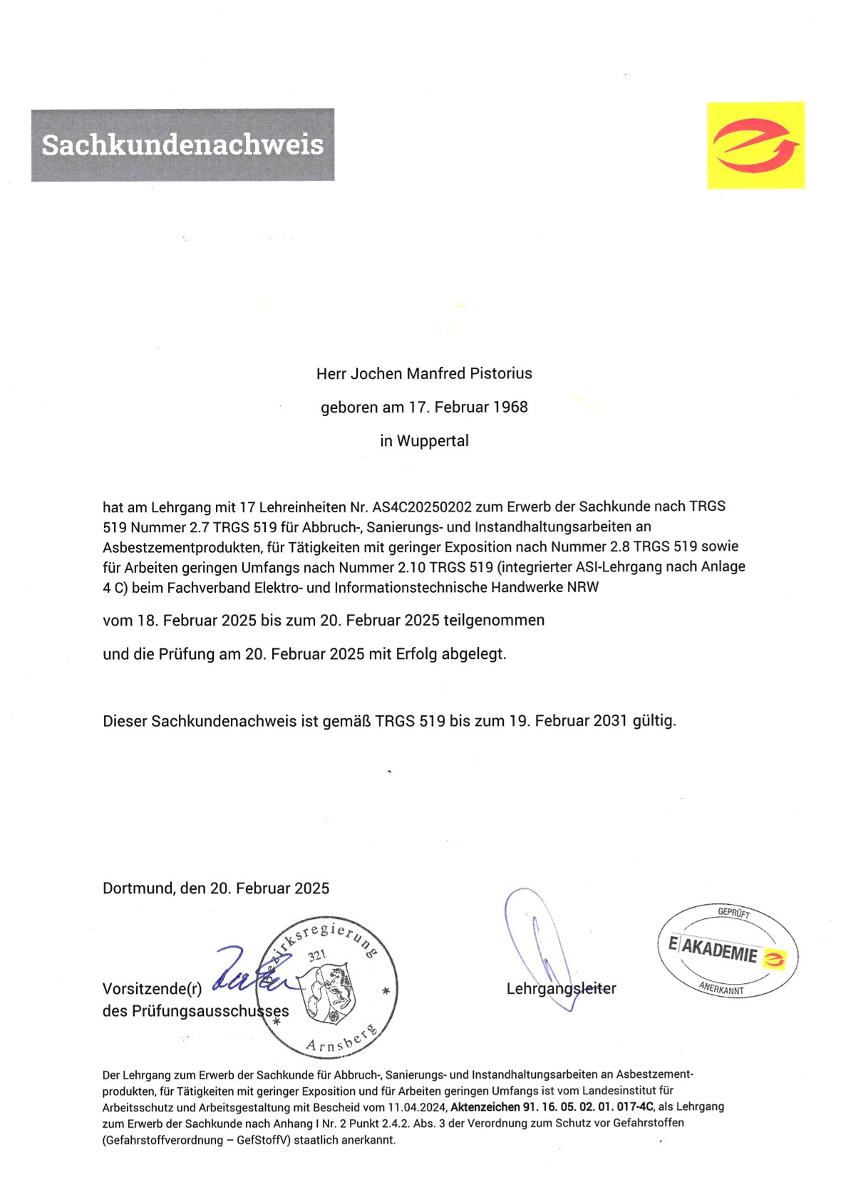 Als eingetragener Meisterbetrieb legen wir großen Wert auf fachliche Kompetenz, normgerechtes Arbeiten und kontinuierliche Weiterbildung. Unsere Zertifikate, Mitgliedschaften und Qualifikationen stehen für Qualität, Sicherheit und Vertrauen – schwarz auf weiß.